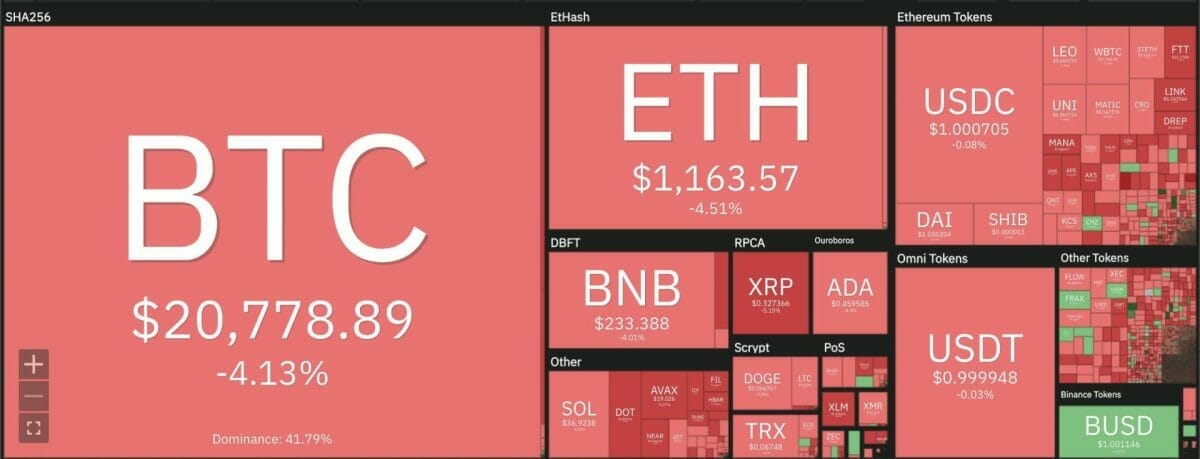 The larger cryptocurrency market fell into the hands of bears once again over the past 24 hours, with all major cryptocurrencies recording damaging declines in price. Bitcoin fell 4 percent to move below the $21,000 mark, while Ethereum moved down to $1,100 with a similar drop. Among leading Altcoins, Cardano shed 4 percent to sit at $0.46, whereas Ripple dipped 6 percent to move down to $0.32. Dogecoin also dropped 4 percent to move as low as $0.66, while Solana and Polkadot moved down to $36.94 and $6.83, respectively.