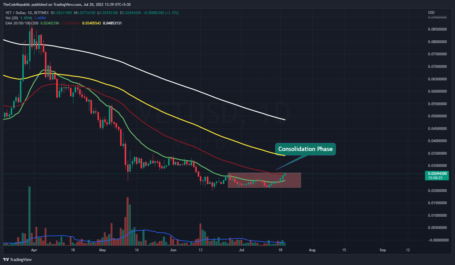 VeChain price is trying to break out of the consolidation phase over the daily price chart. The token looks determined to register its breakout with a recovery phase. However, due to the ongoing bear market sellers may strike this uptrend momentum of VET crypto. The VET coin is now trying to sustain at the upper range of the consolidation phase and the token is trying to get support at the higher level. Meanwhile, bulls must try their best to save the token from falling and they must sustain to register the token’s breakout. VET has been consolidating inside the price range of $0.021 and $0.027.