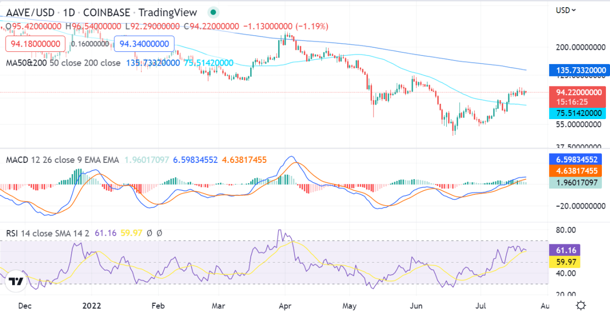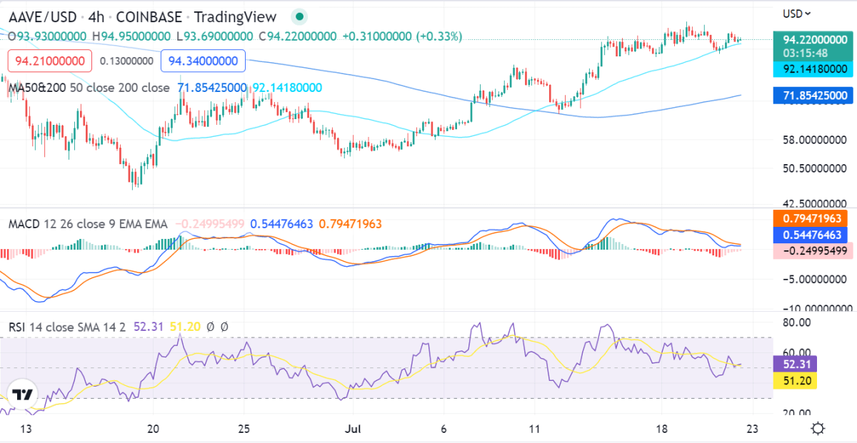 Aave price analysis on the 1-day price chart shows that the price is currently facing rejection at the $97.04 level. If the price can break out of this level, it is likely to test the $100 level in the near future. The current price surge has taken the prices to the upper limit of the consolidation range and a further move up may take place in the near term as the price is currently trading at $93.65.