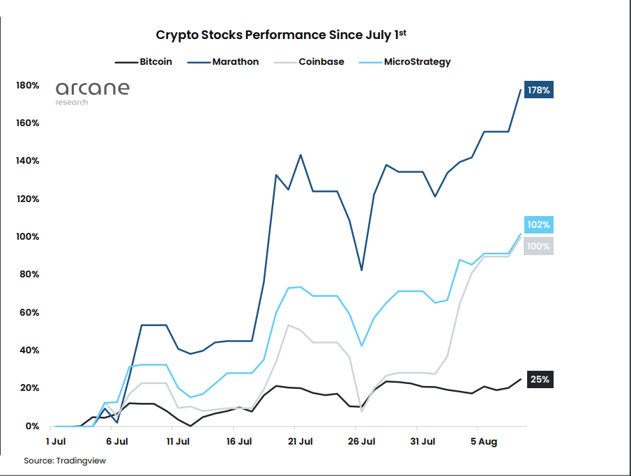 In the first week of July, the price of BTC led a strong increase in the price of all cryptocurrencies. Not unexpectedly, this contributed to the rise of Bitcoin mining stocks, an Arcane research shows.