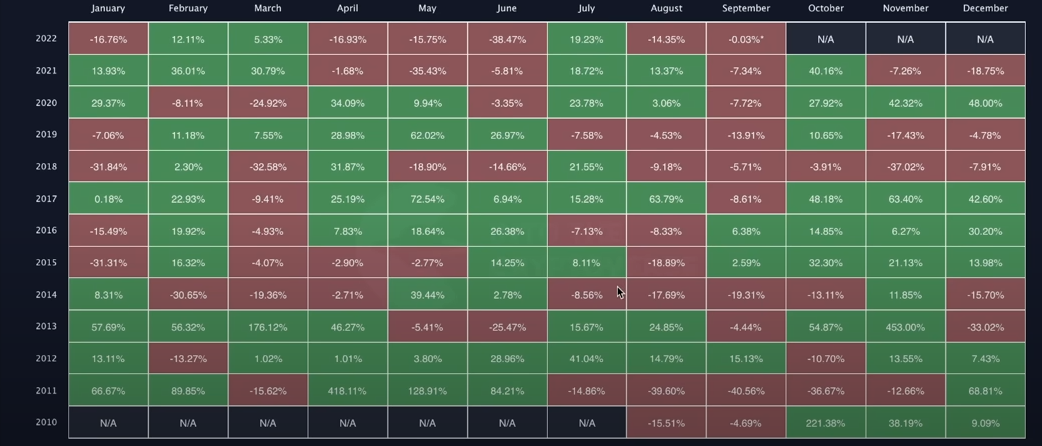 “You can see that on average, from 2010, the only month that’s in the red is September. The last time September was green for the total asset class was all the way back in 2016 and 2015, but we’ve had five years in a row where September was not that great of a month, and if you take this back to say 2017, the average return in September is about 7.5% to the downside.”