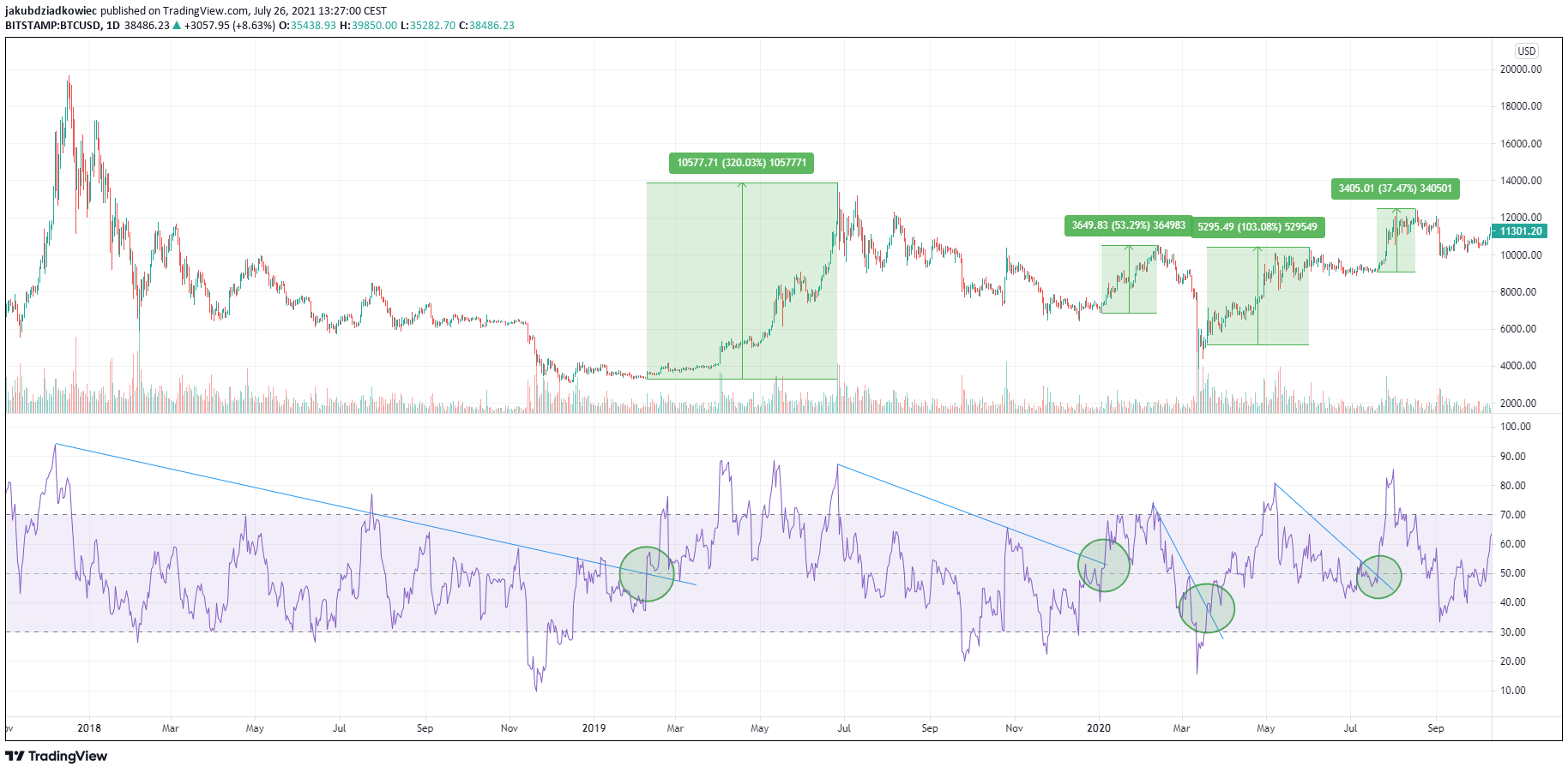 Using a simple extrapolation of this average to the bitcoin price at the time of the current RSI breakout, we can estimate a hypothetical upward movement target. The close of the daily candle on July 21 was at $32,138. Increasing this value by 166%, we get a BTC target of $85,487.