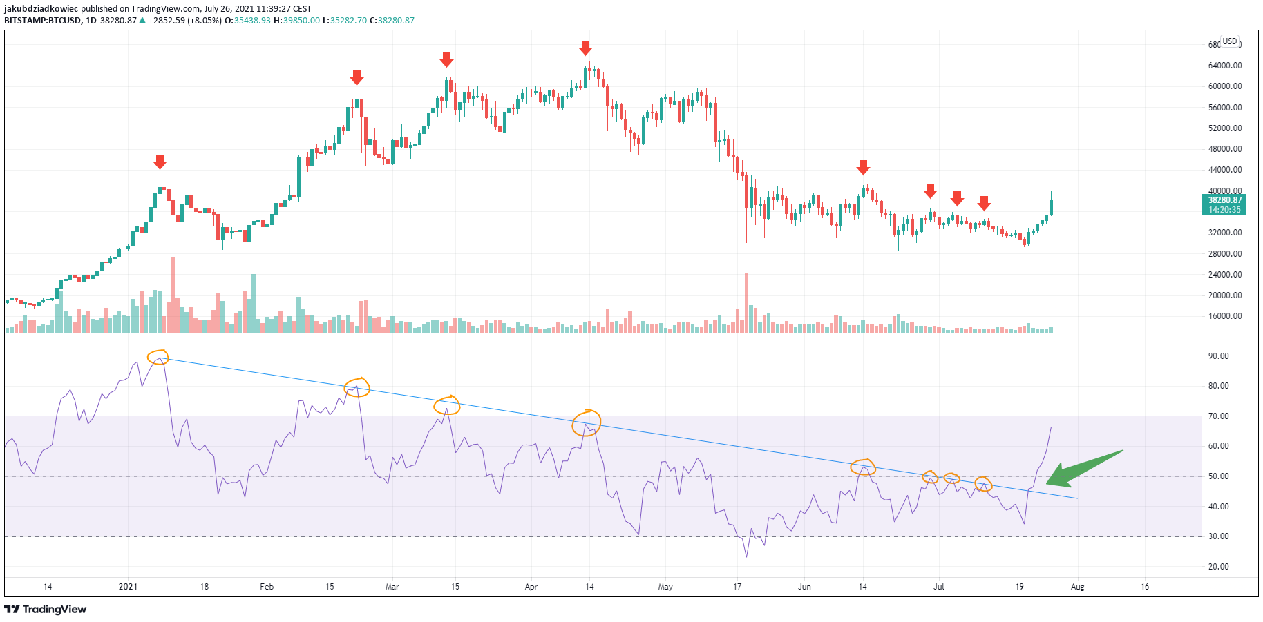 Today the indicator records a value of 66 and is at its highest since April 16. Just after bitcoin set the ATH. The bitcoin price chart follows the bullish signal from the RSI as it has just regained the support area at $38,000.