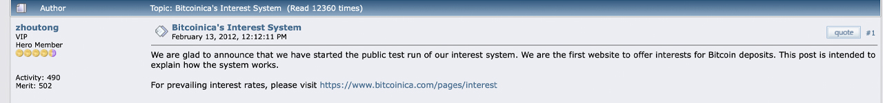 By September 2011, Bitcoinica was the second-largest bitcoin trading platform by volume behind Mt Gox. “We are glad to announce that we have started the public test run of our interest system,” the Bitcoinica founder wrote on February 13, 2012. “We are the first website to offer interest for Bitcoin deposits. This post is intended to explain how the system works — Assuming you deposit $10,000 with us and the interest rate is always 4.17, you will get $4.17 every day or $1,644 every year (with compound interest).”