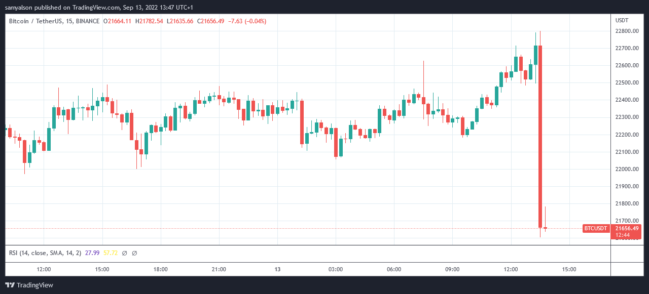However, on the release of CPI data at 13:30 UTC, $BTC’s immediate reaction was a 5% downside swing to bounce at $21,600.