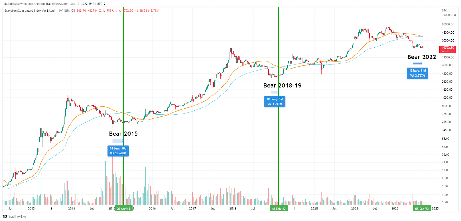 - 2022: 12 weeks / 84 days from the bottom at $17,607