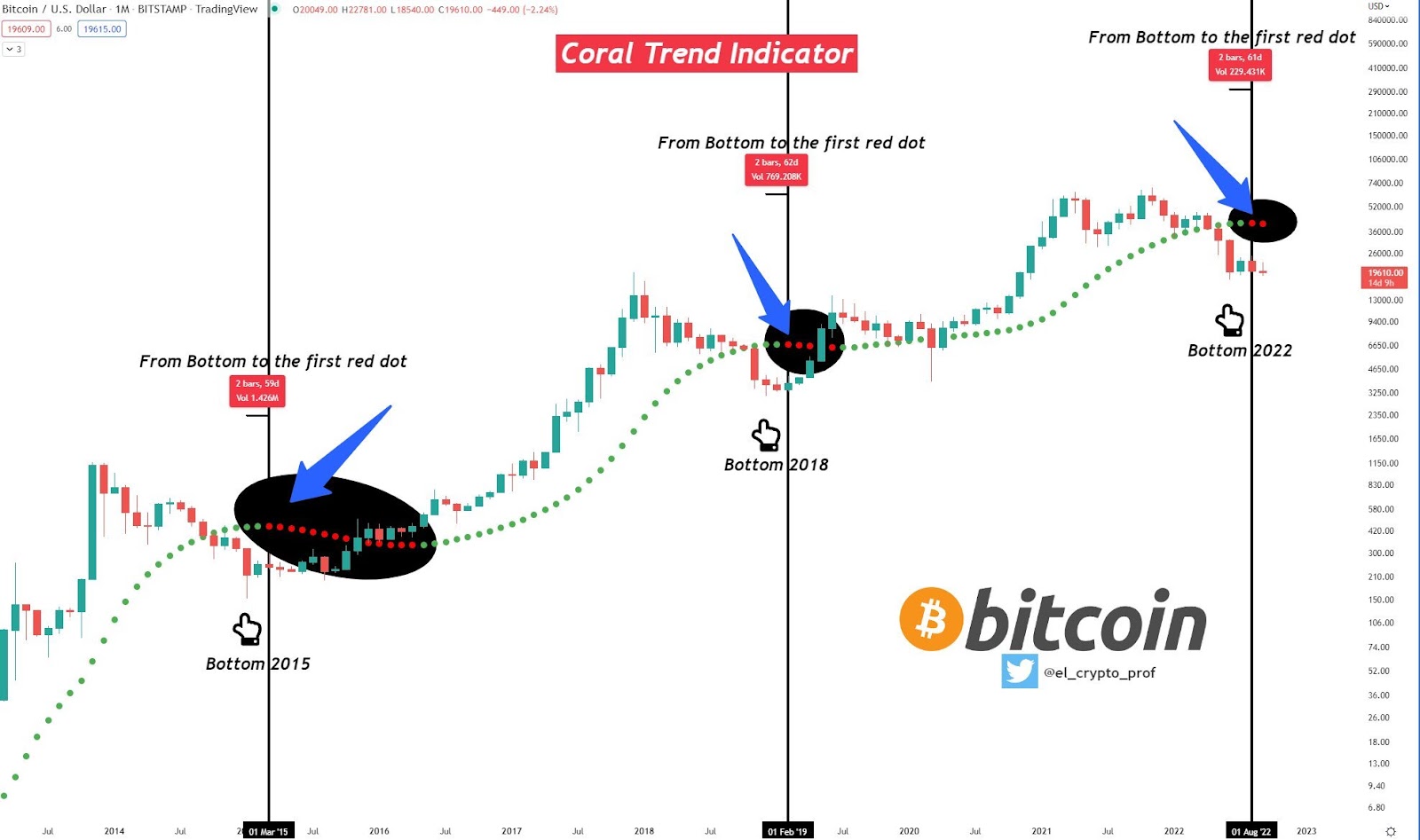 The analyst points out that the first red dot on the Coral Trend Indicator chart appeared approximately 60 days after reaching the absolute bottom of the bear market (blue arrows). This happened both in 2015 and at the turn of 2018-2019.