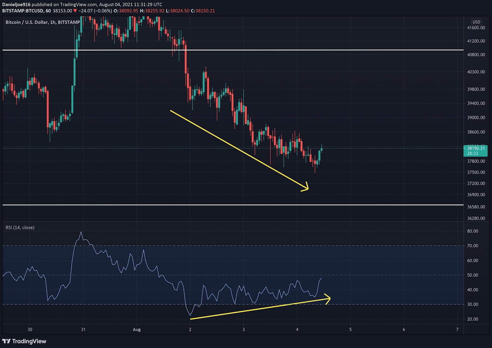 The near term technicals are showing early bullish signals of a potential local bottom. The hourly chart has been showing a bullish divergence as the price has been falling while the relative strength index has been rising. BTC has been building a base of around $37.6k, which is a signal of selling pressure weakening.