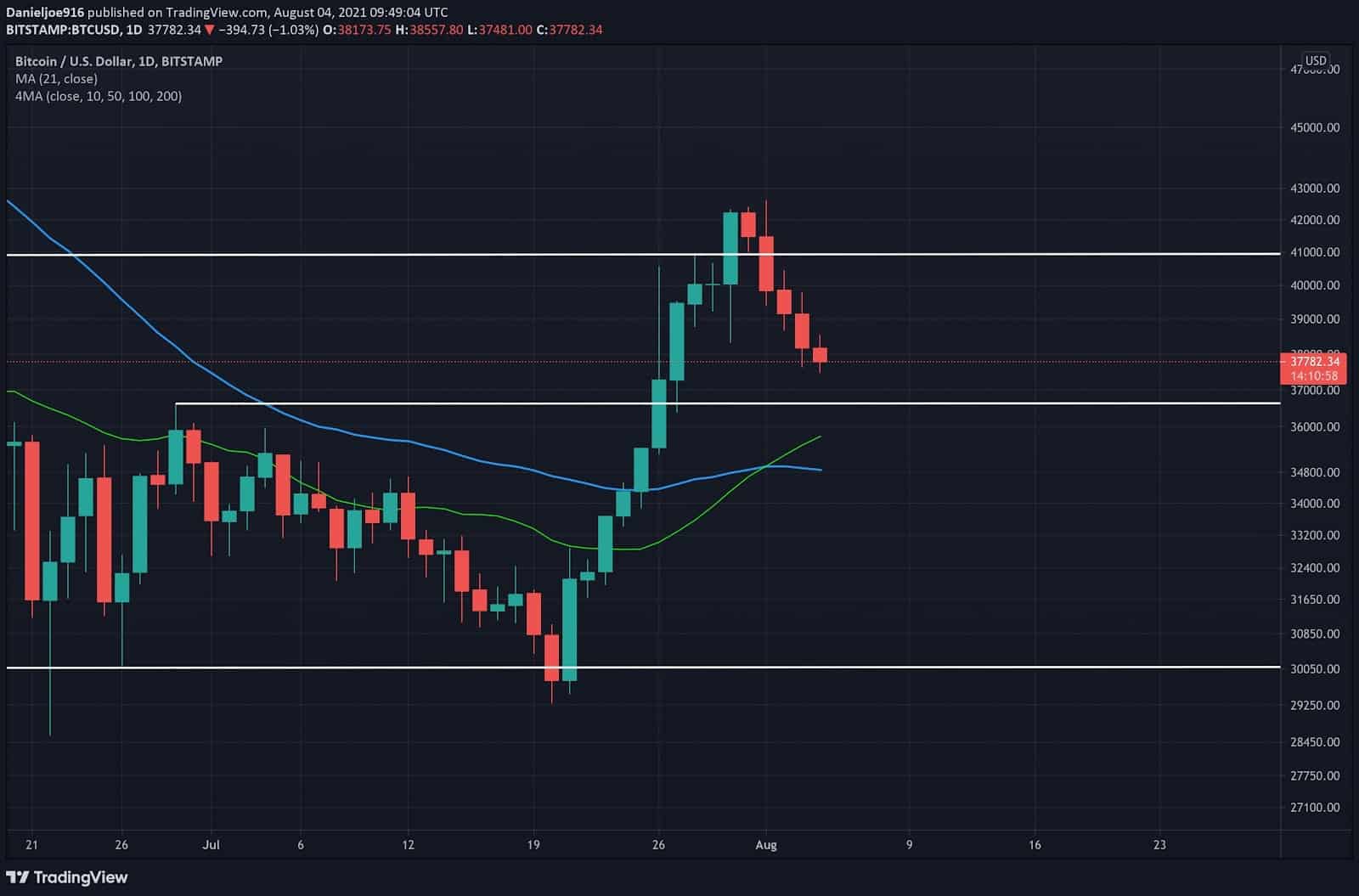 This key zone marked in green must hold support to sustain a bullish market structure. A near-term pullback to this green zone, then a technical bounce to retest 40k, is exactly what the bulls need to see.