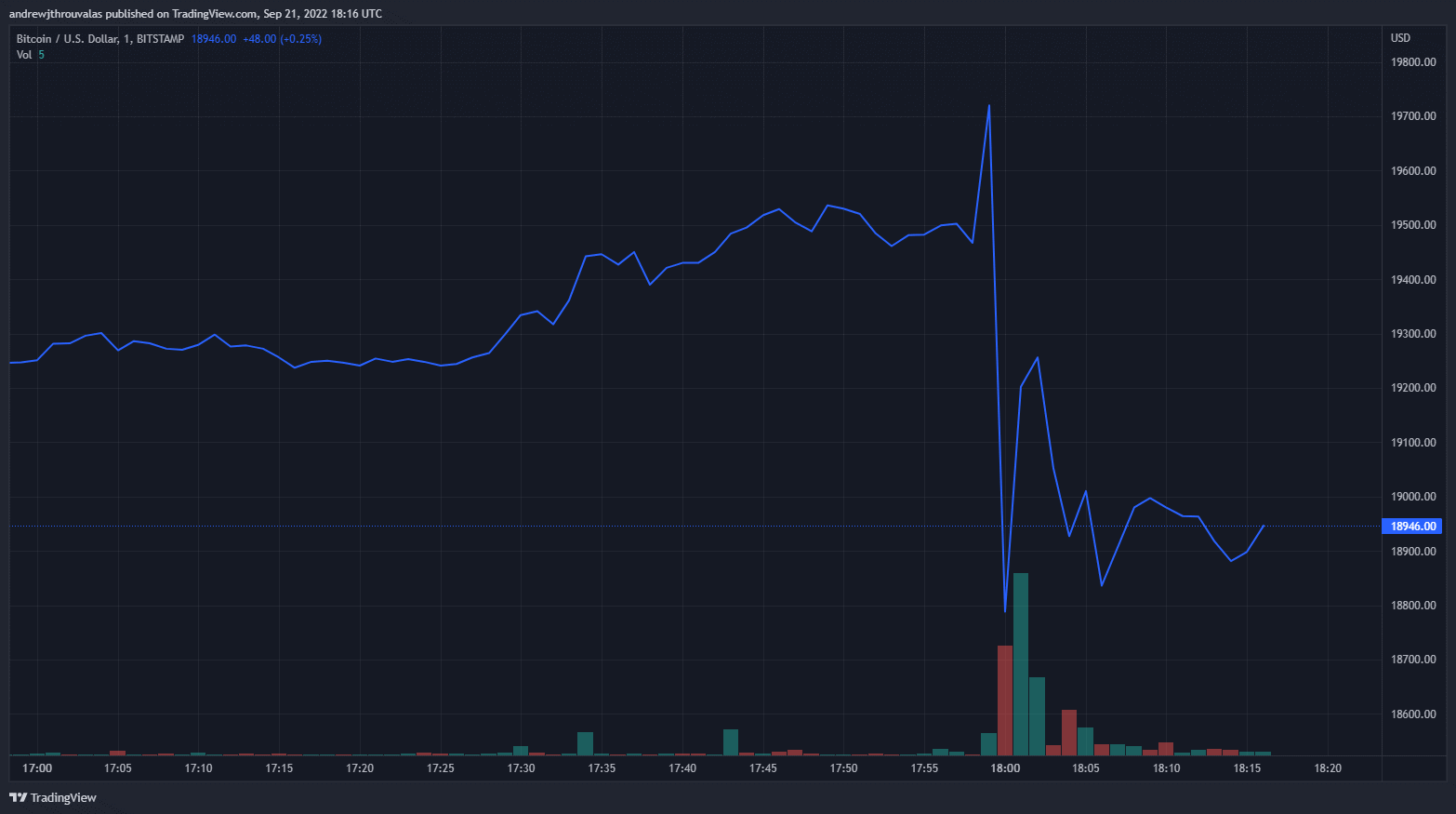 - Merely 1 minute after the announcement, Bitcoin fell from roughly $19,700 to $18,700. It’s since recovered to about $18,946, at the time of writing.