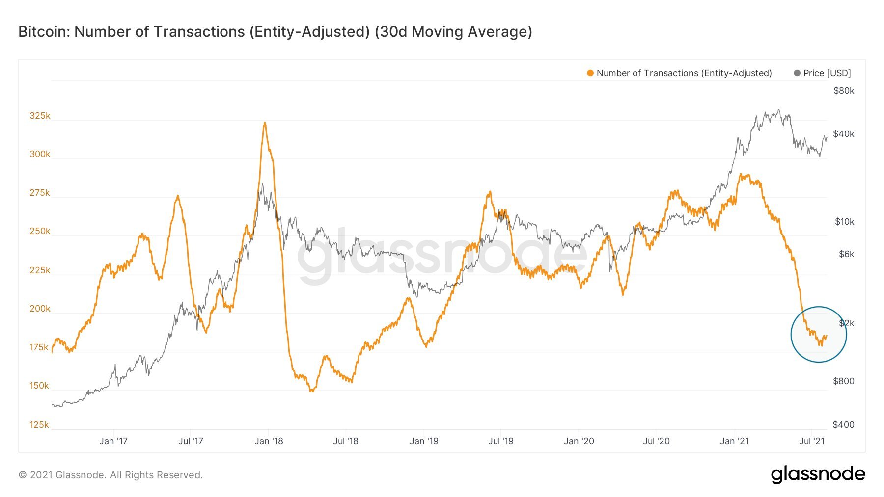 The number of transactions on the Bitcoin network has reached a 2-year low. On-chain analyst Lex Moskovski tweeted today a chart of the 30-day moving average Entity-Adjusted Number of Transactions. It shows that the value has fallen to a level in the area of 180,000, which has not been recorded since January 2019.
