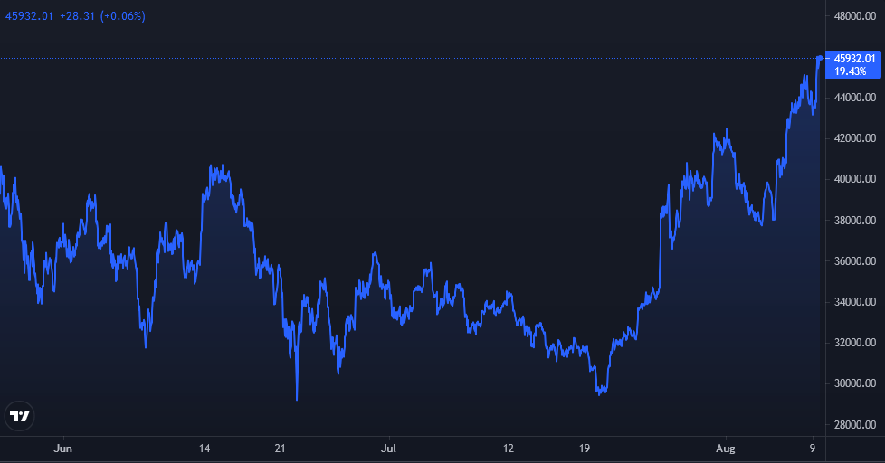 Bitcoin has continued to move up over the weekend as the coin breaks above $45k for the first time since 16 May. It’s unclear whether the crypto can retain the trend and keep pushing forward, or if it would hit another resistance wall and slip back down.