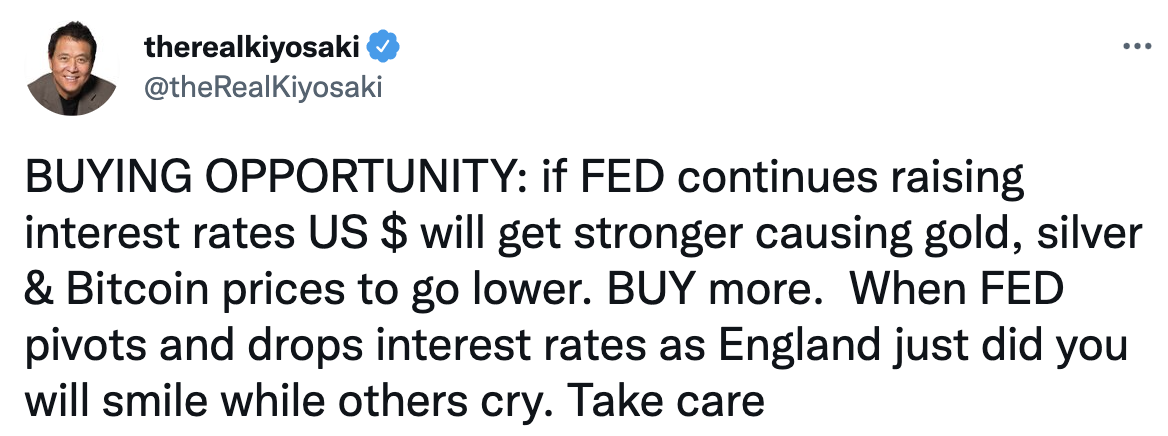 With the Federal Reserve about to raise interest rates 75 basis points for the fourth time in a row, Robert Kiyosaki, who appeared in a Kitco interview on Monday, suggests that this is a good time to take advantage and buy precious metals and bitcoin.