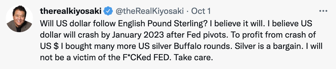 He points out what has recently happened with pound sterling, whereby the plunge in its price together with other issues, especially in the gilts market, forced the Bank of England to pivot and start to follow a quantitative easing policy once more. Kiyosaki believes the same will happen with the dollar.