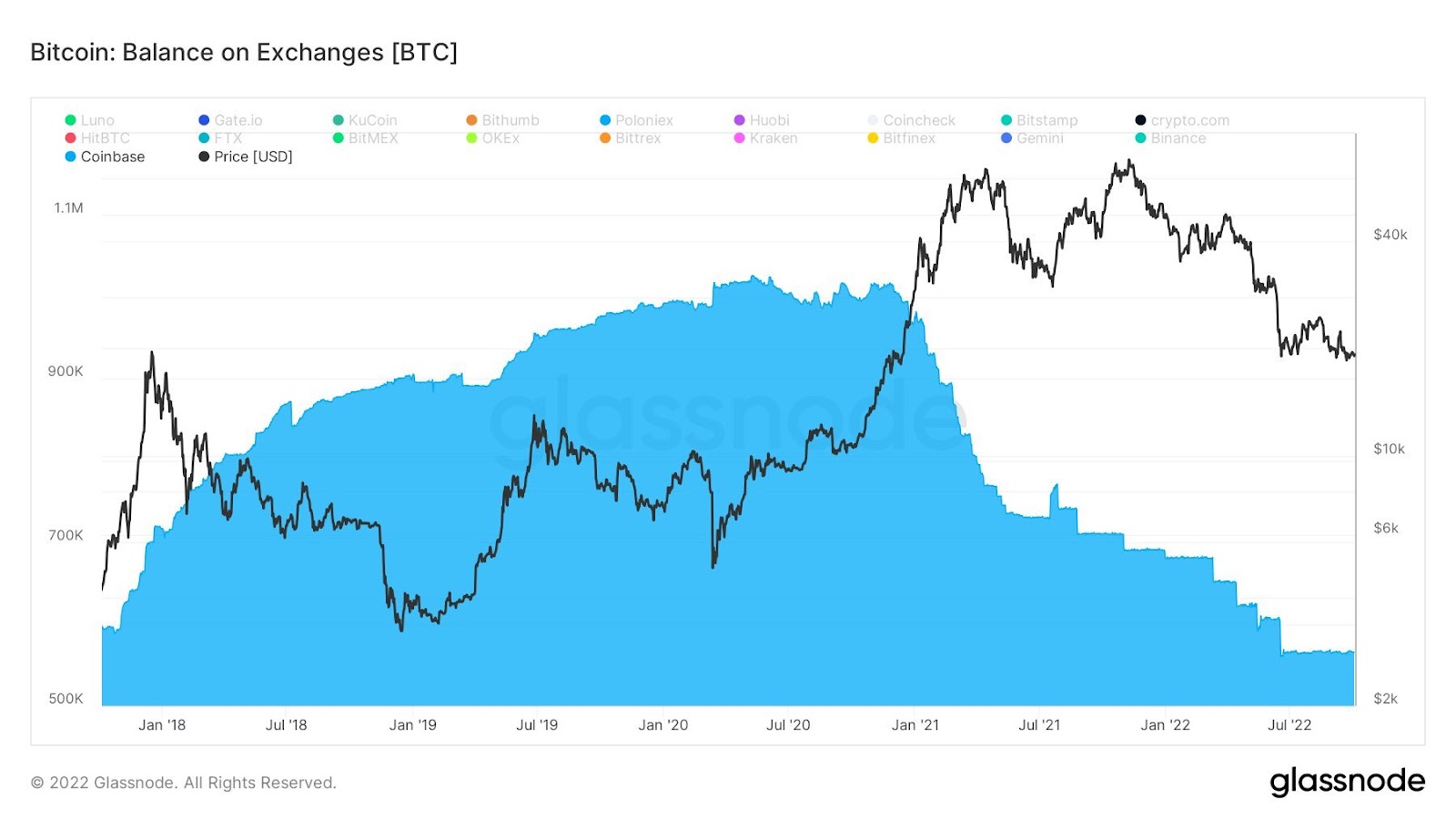 The first chart published by @IIICapital shows how the volume of Bitcoin on Coinbase has been steadily dropping since the beginning of the bull market initiated in Q4 2020. Interestingly, the reversal of the trend in the price of BTC and its declines in 2022 has not stopped the outflow of coins from the exchange at all. Only the period from June to now shows a clear stagnation in the blue chart and relative stabilization of BTC supply on Coinbase.
