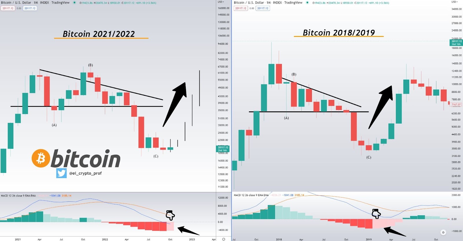 The last way to find signs of the end of a bear market and trend reversal on Bitcoin’s chart is long-term technical indicators. One of them is the monthly MACD, which provided a very clear trend reversal signal in the previous 2018-2019 bear market.