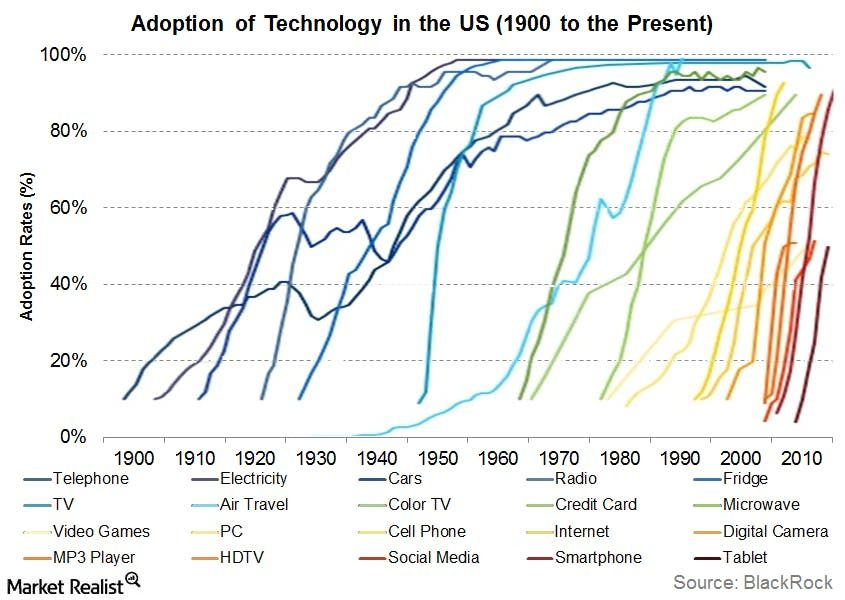 The idea of adoption curves articulates how new technologies have been developed and popularized in broad communities. For example, the chart below shows how new technologies have spread in the United States from 1900 to today.
