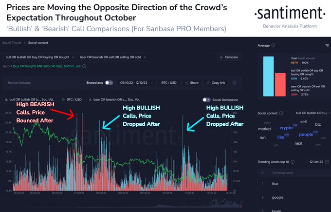 “Though the long-term crowd sentiment has remained negative, swing trades in October have been dictated by how often bullish and bearish calls are happening. When social platforms show too much bearish sentiment, prices bounce. When bullish, prices drop.”