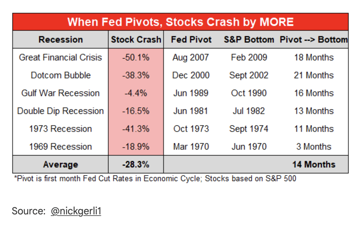 In each case, stocks extended losses, falling by an average of 28%, after the Fed cut rates to stimulate the economy, according to data tweeted by Nick Gerli, CEO and founder of Reventure Consulting.