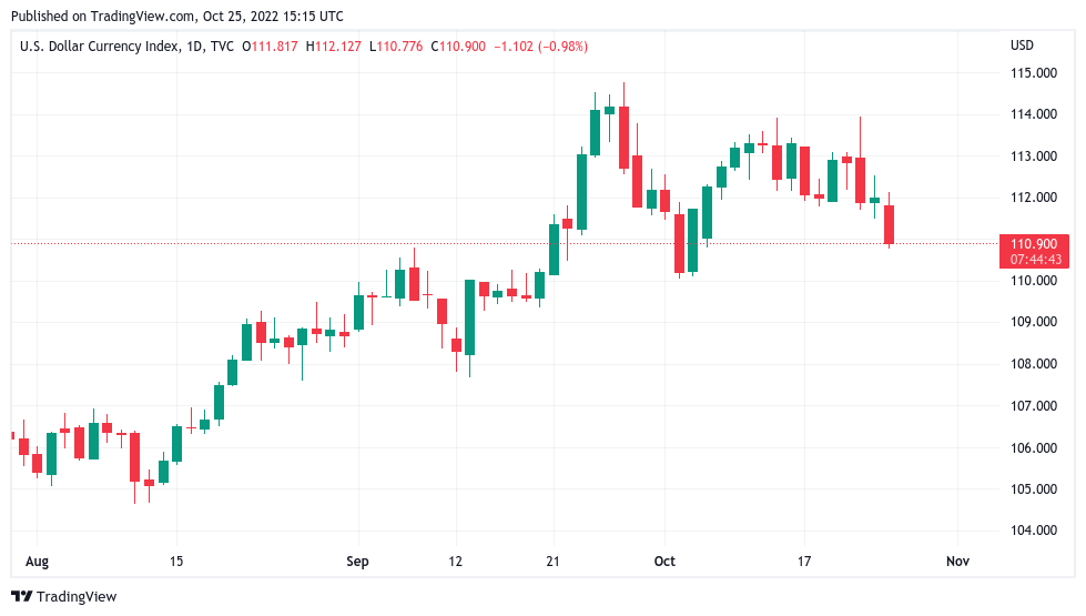 The U.S. dollar index (DXY) conversely lost ground on the day, falling to its lowest levels since Oct. 6 and providing potential tailwinds for risk assets to seal opportunistic gains.