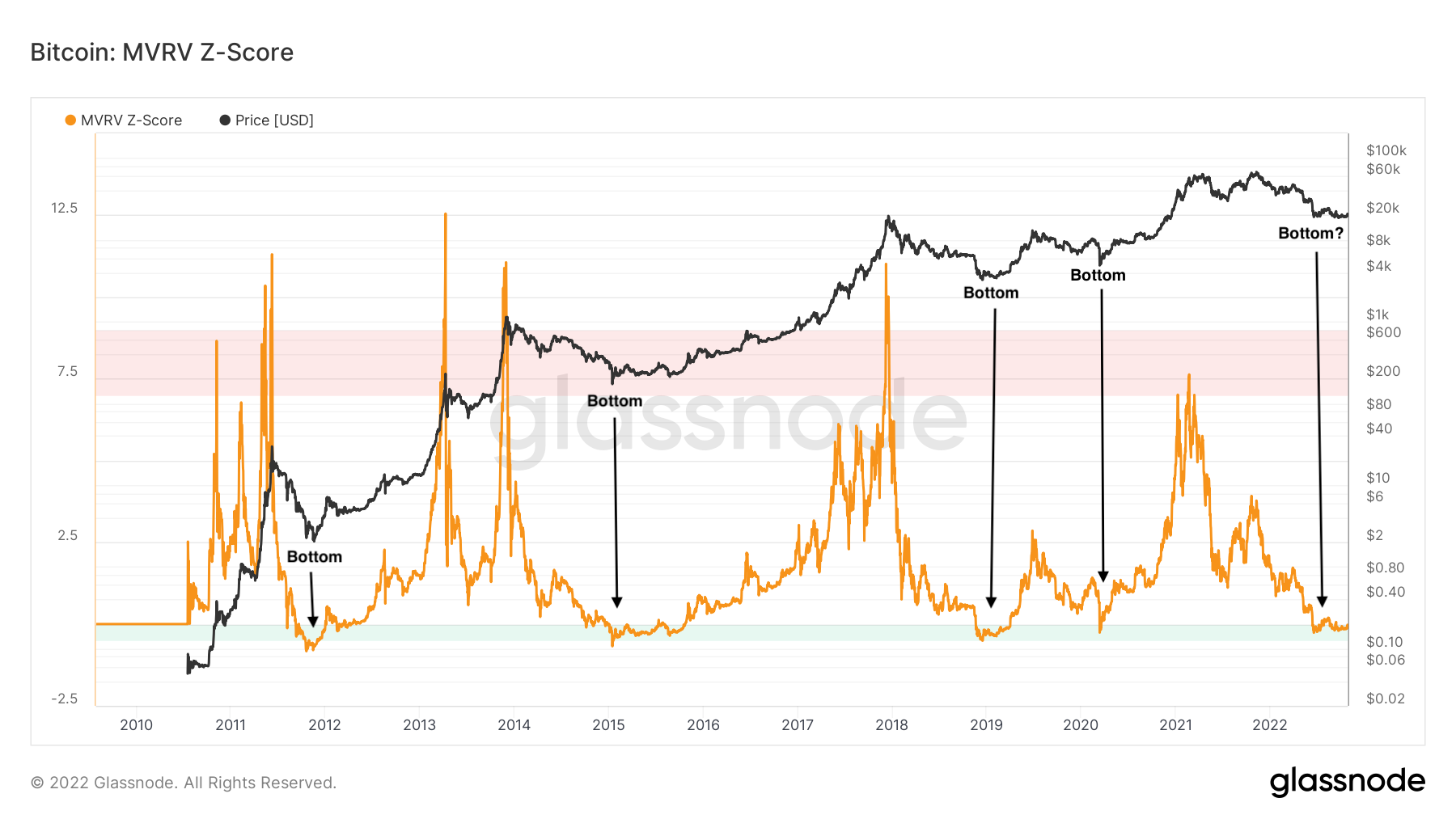 For instance, Bitcoin's Market Value-to-Realized Value (MVRV) Z-score, which measures the coin's over/undervalued relative to its fair value, has dropped into the region that has coincided with previous bear market bottoms, as shown below.