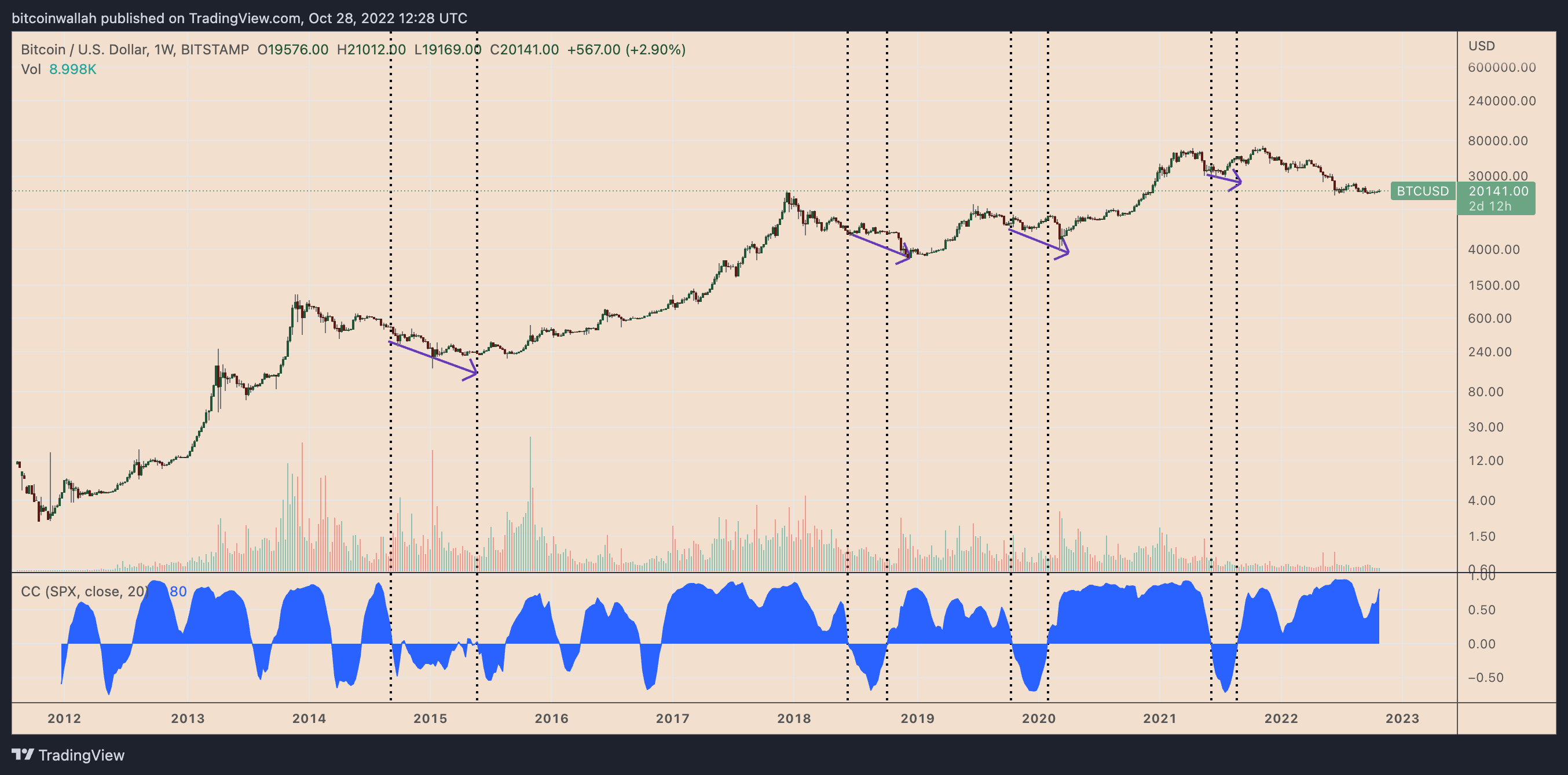 Previously, the Bitcoin market recovered weeks or months after its correlation with U.S. stocks dropped below zero. The chart below shows four instances from the 2014-2016, 2017-2018, 2019-2020, and 2021.