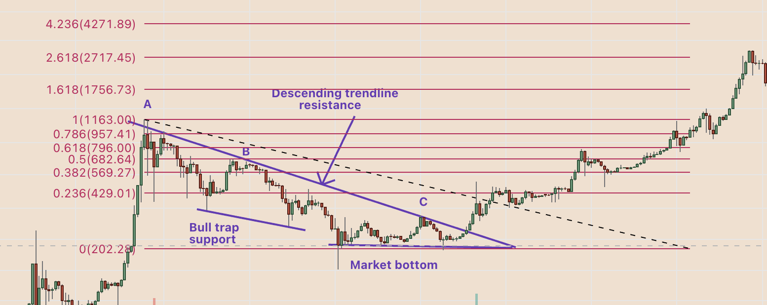 Bitcoin eventually bottomed at a horizontal trendline support near $200, following it up with a strong breakout above the descending trendline resistance, reaching the 0.236 Fib line of $429. By December 2017, its price had reached nearly $20,000.