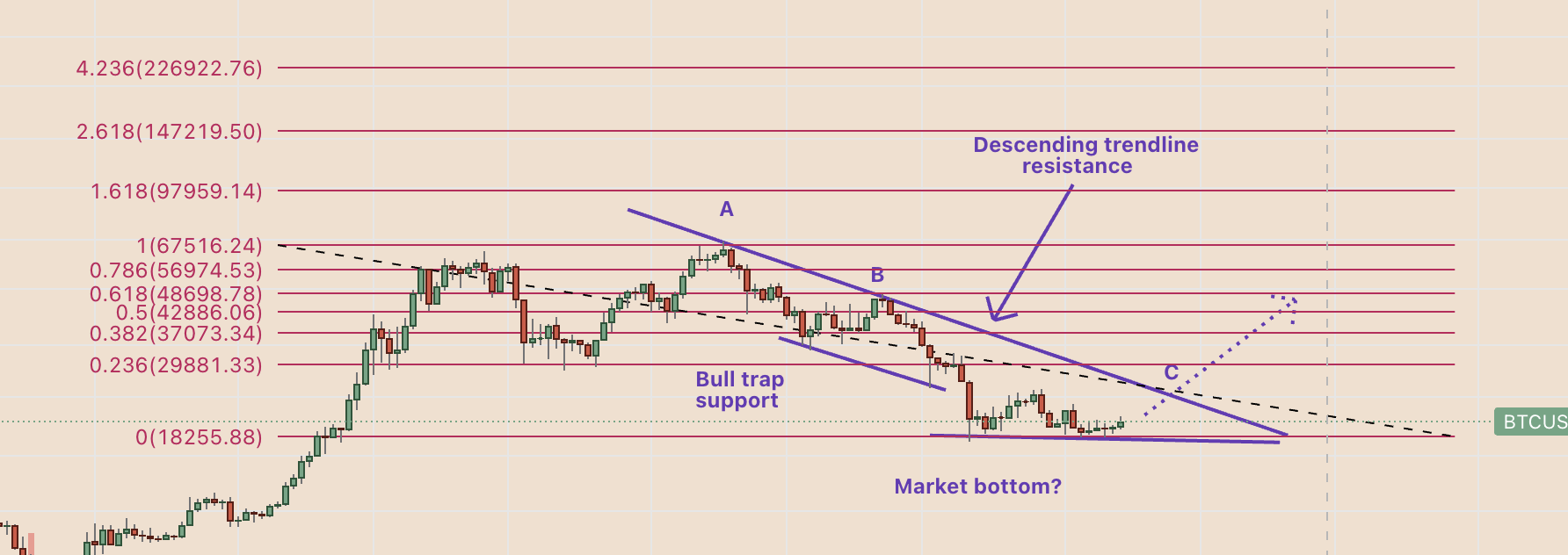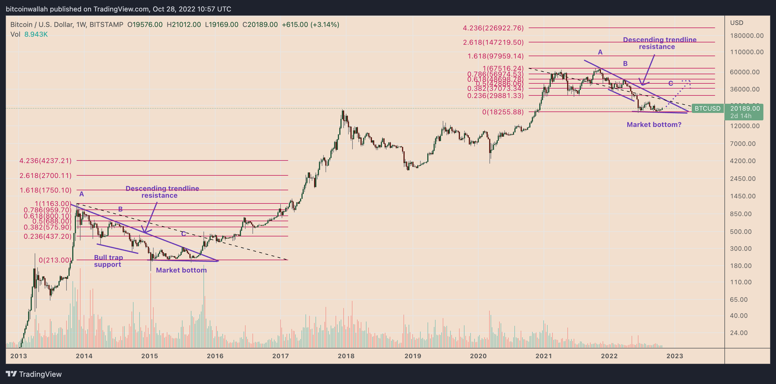 Bitcoin's 2022 bear market also shares similarities to the price trends witnessed in 2013-2015, comprising a descending trendline resistance, a weak bull trap support trendline, and a horizontal support level.