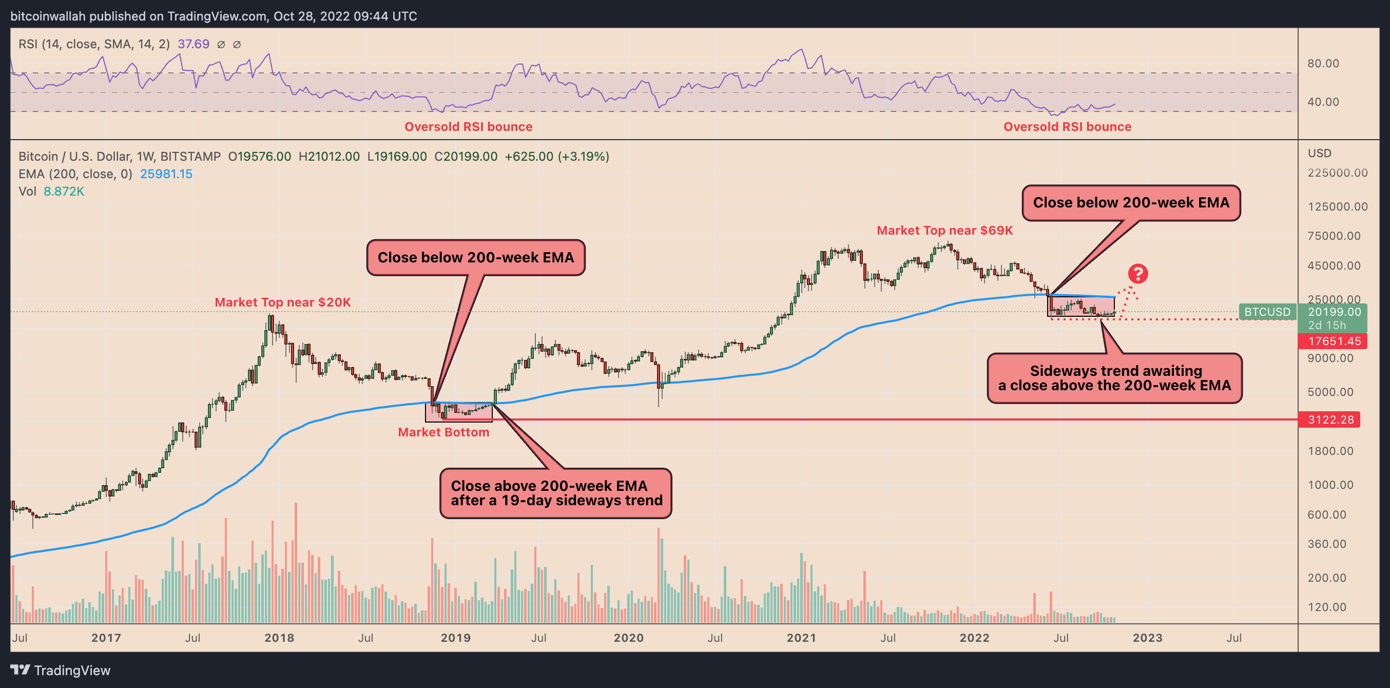 Except in 2018, Bitcoin's sideways trend lasted for nineteen days, with the price reclaiming its 200-week EMA as support, followed by moves toward approximately $14,000 in June 2019. In 2022, the sideways trend entered its 19th day on Oct. 28 but awaits a clear breakout above the 200-week EMA near $26,000.