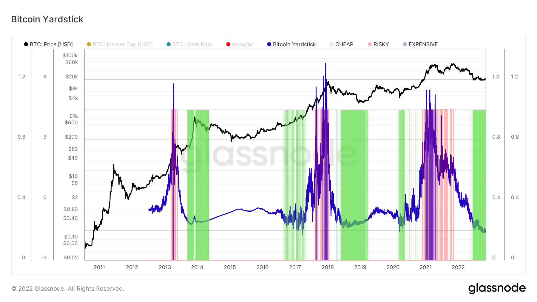 The Bitcoin Yardstick measures the ratio of Bitcoin market cap to hash rate — two fundamental metrics which, when compared to one another, offer key price insights.
