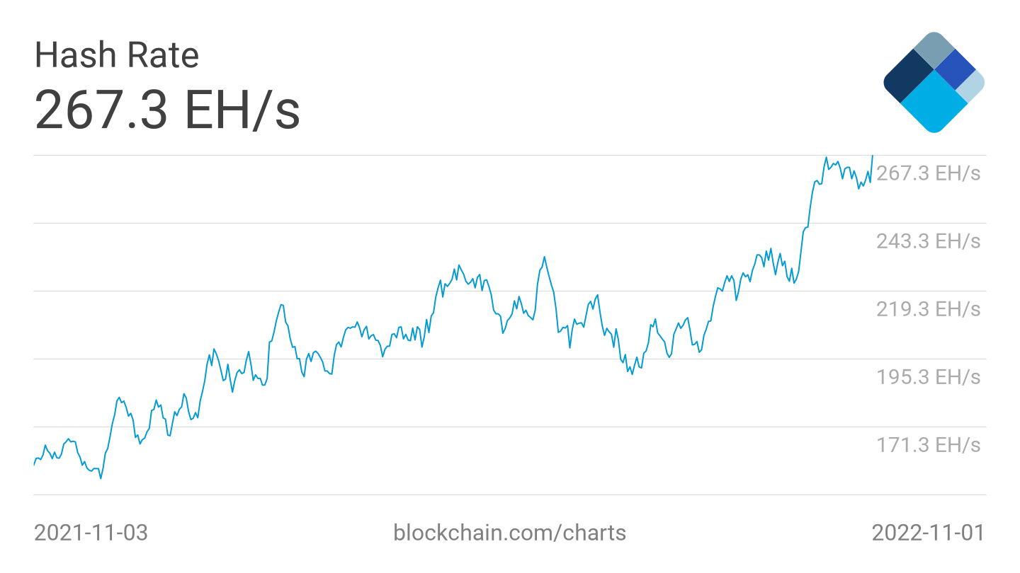 Currently, Bitcoin network hash rate is near all-time highs, while price is down around 75% from its last all-time highs seen in November 2021.