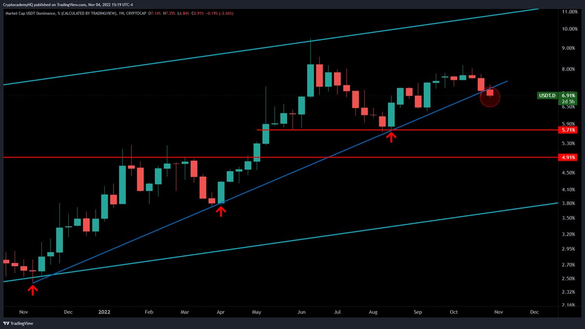Analyst Justin Bennett tells his 110,600 Twitter followers that the Tether dominance chart (USDT.D) is on the verge of violating the diagonal support that has kept the metric in an uptrend since November 2021.