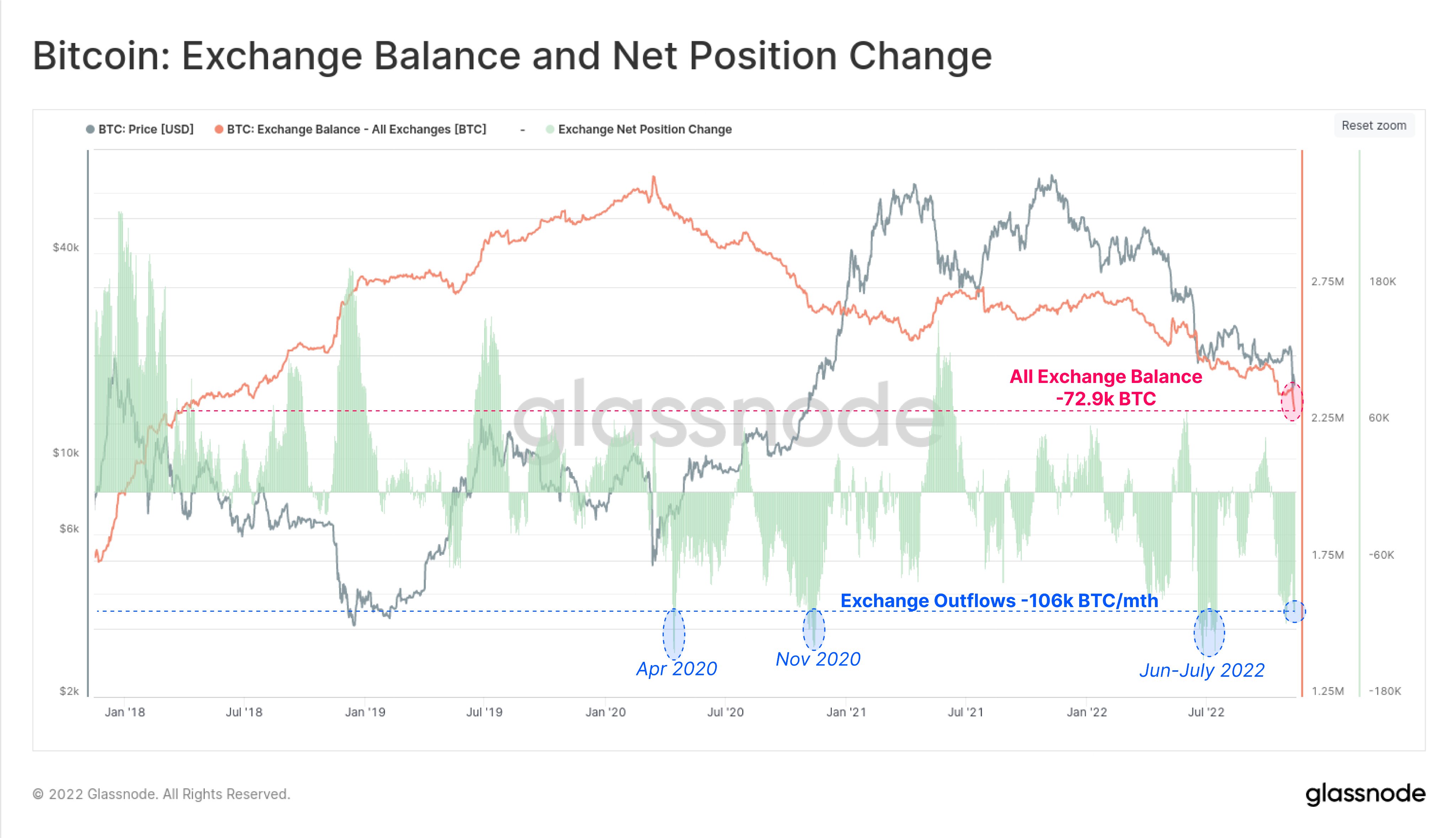 “Following the collapse of FTX, Bitcoin investors have been withdrawing coins to self-custody at a historic rate of 106,000 BTC/month.