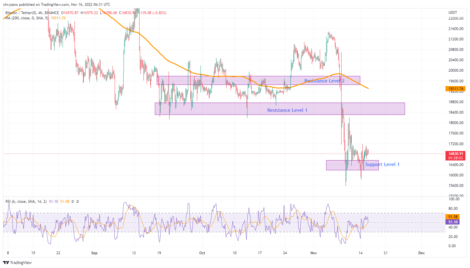Meanwhile, BTC is traversing uncharted territory after the crash of the FTX exchange. However, since this is no familiar territory for BTC, it could be looking at hitting Resistance Level 1, as indicated in the chart.