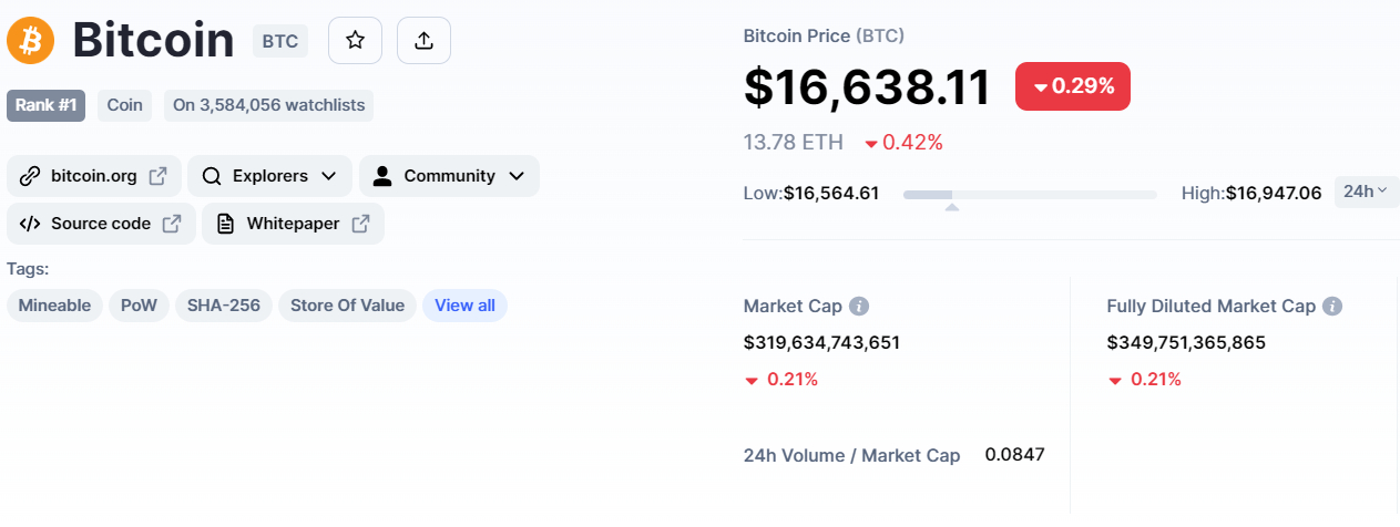 It began trading at $16,827, with a high of $16,832 and a low of $ 16,673. BTC/USD is currently trading at $16,790.00, up by 1.62% in 24 hours. Moreover, its price has dropped by over 4% in a week.