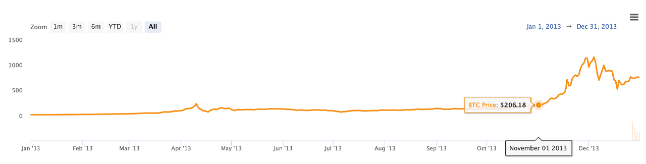 On Nov. 1, 2012, BTC was $11.20 per coin and on Nov. 30, 2012, the price per bitcoin was $12.45. In November 2013, BTC jumped a whopping 447% against the greenback that month. At the time, the price rose from $206.18 per BTC to $1,129 a bitcoin.