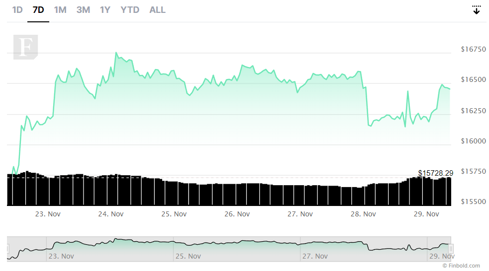 As things stand, Bitcoin is changing hands at the price of $16,504, up 1.63% on the day, as well as 4.87% across the previous seven days, although its losses on the monthly chart amount to 20.57%, as charts show.