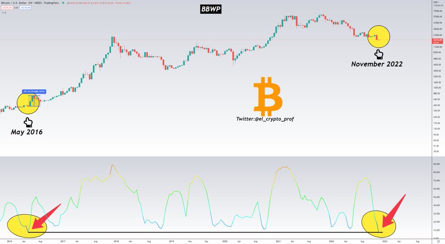 Indeed, taking into account the Bollinger Band Width Percentile (BBWP) indicator, which is the lowest it has been in over six years on the two-week chart for Bitcoin, the flagship digital asset could be bracing for a dramatic upward move.