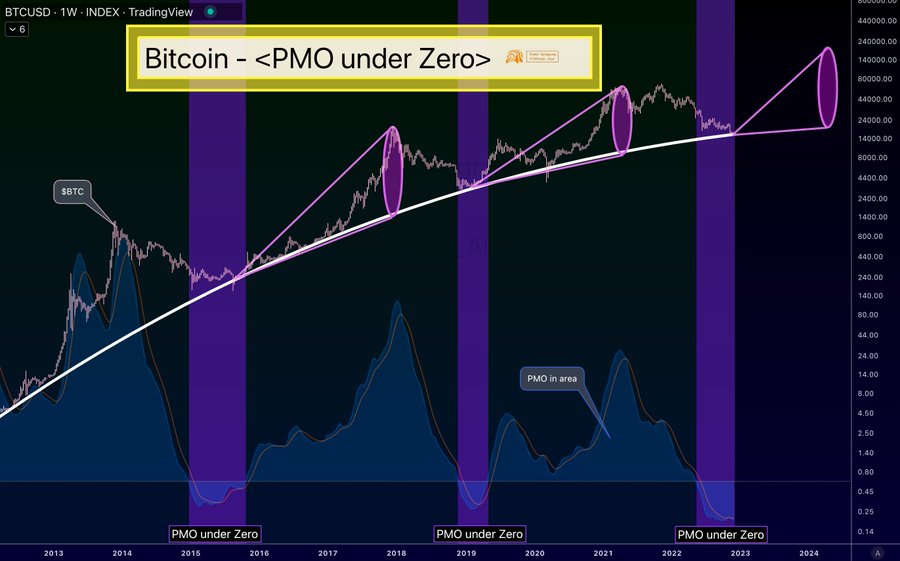 In Bitcoin’s case, Trader Tardigrade explained that the PMO is currently under zero, which, combined with being “in contact with the curved support,” could “trigger a bounce,” which, according to the expert’s chart, could happen sometime in 2023, toward 2024, possibly peaking at around $24,000.