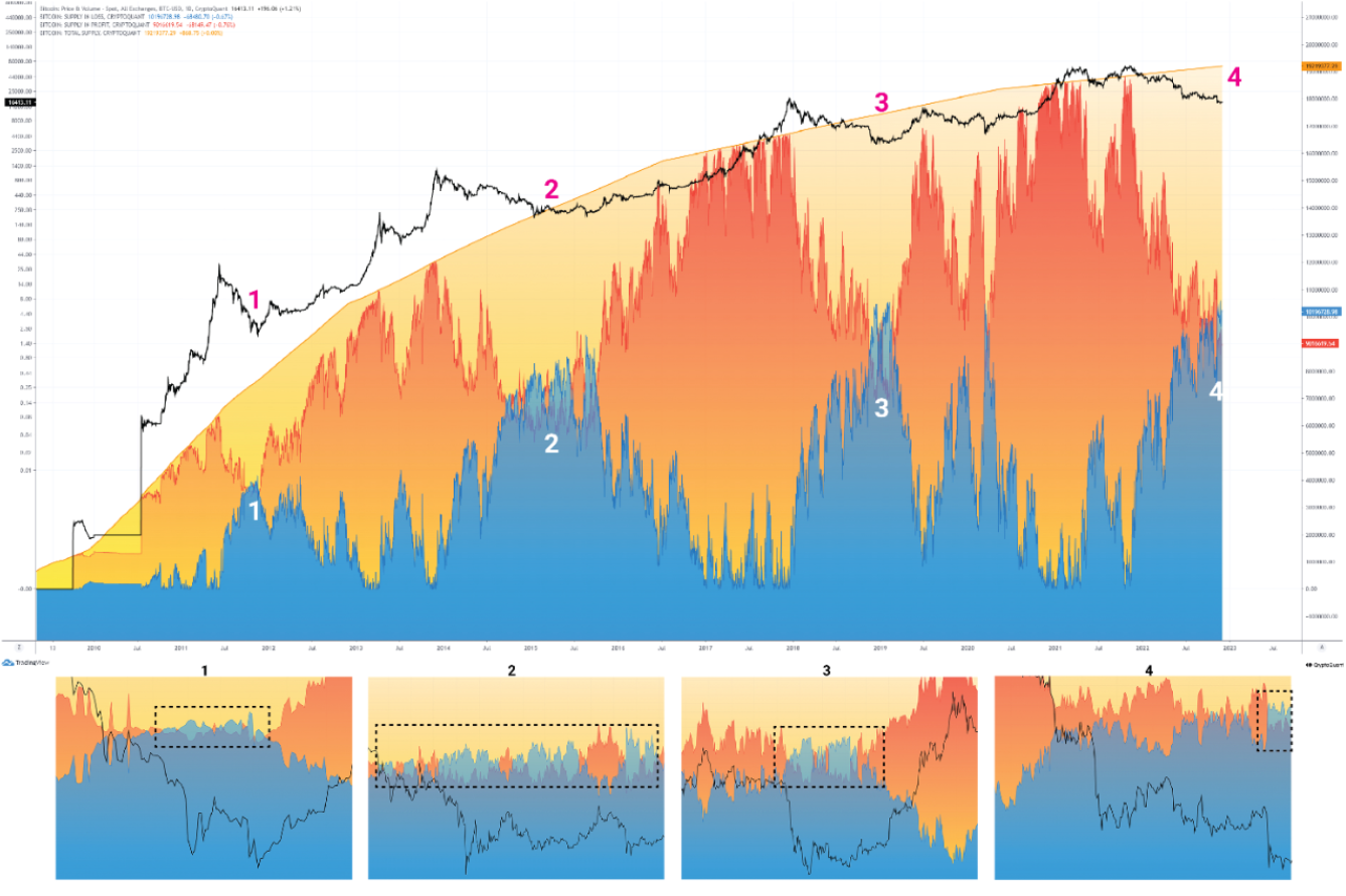 “Over nearly 13 years, with four cycles, we have all noticed an area of intersection between supply loss and profit every time the price is in the bottom zone. Even in the early stages, when Bitcoin was valued at only a few dollars, this area existed.”