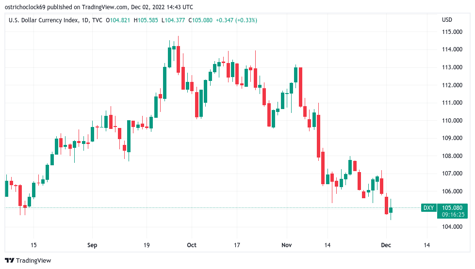 Another popular Twitter analytics account, Cold Blooded Shiller, additionally entertained the idea of a “Santa rally” should macro data and comments from the Federal Reserve complement risk asset performance — to the dollar’s detriment.