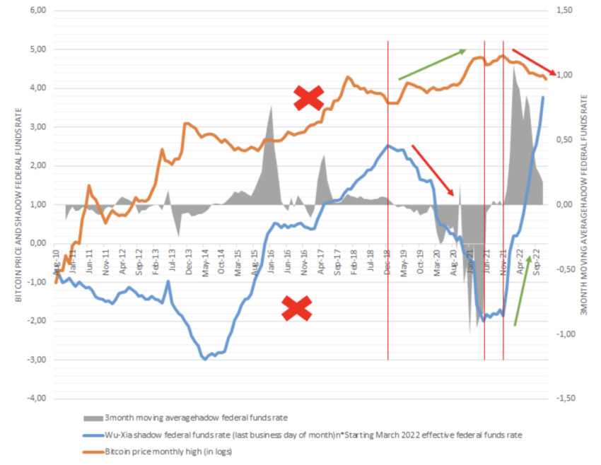 Notably, when the shadow federal funds sharply rose in Dec. 2021, the Bitcoin bear market started.