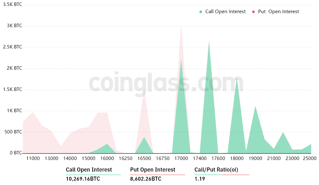The 1.19 call-to-put ratio reflects the imbalance between the $175 million call (buy) open interest and the $145 million put (sell) options. Currently, Bitcoin stands at $16,900, meaning most bearish bets will likely become worthless.