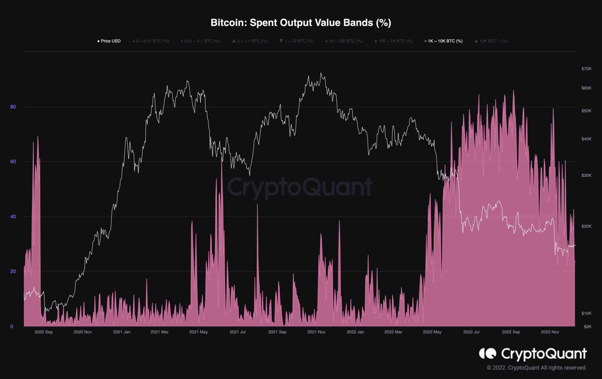 In terms of spending, the ongoing high level of whale distribution is contradictory with a sign that could lead to a market cycle change. On the other hand, a significant portion of the BTC being spent since June 2022 (up to 80% of the total) came from whales.