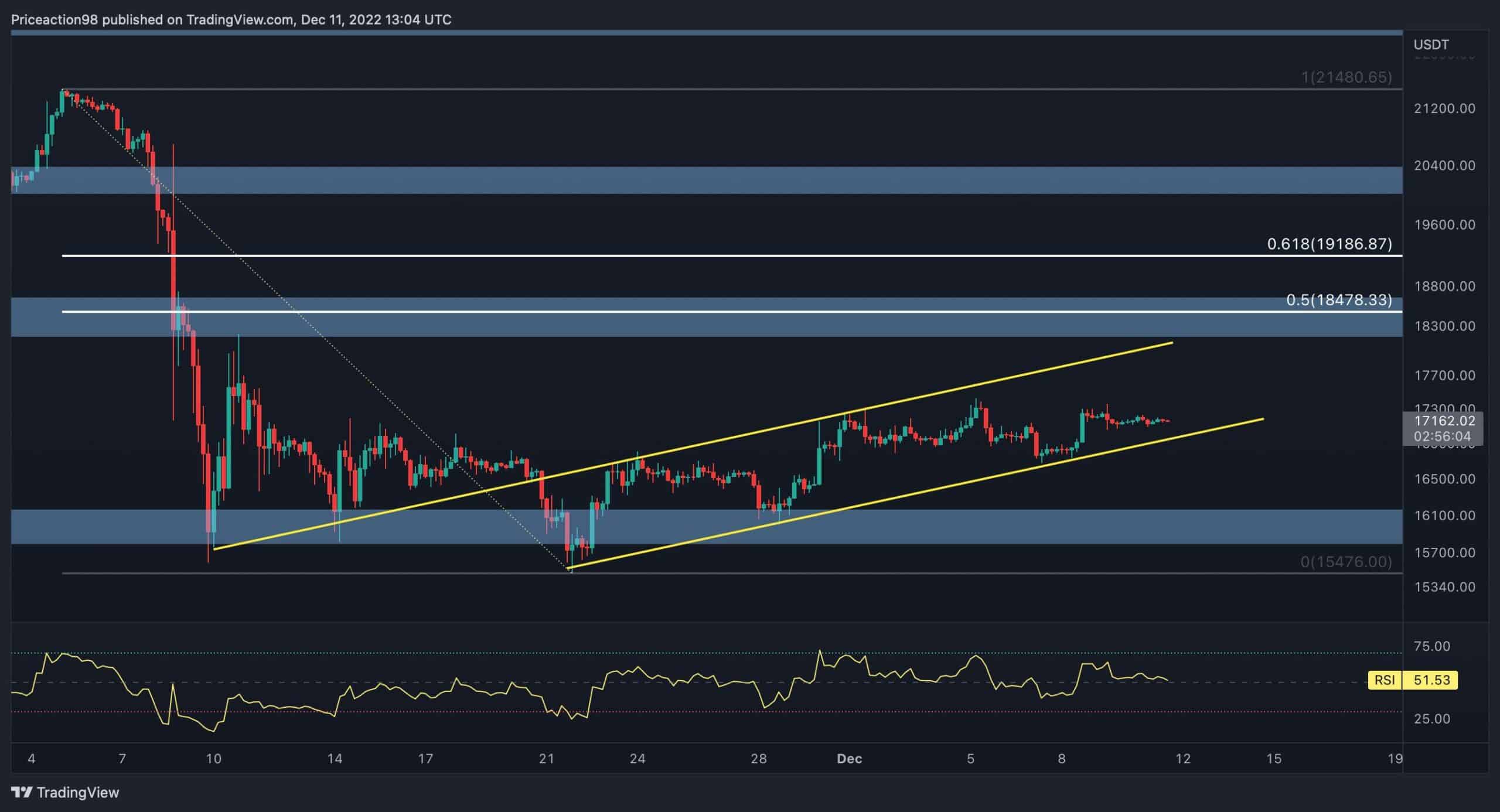 After touching the lower trendline of the descending wedge pattern, the price of bitcoin initiated a mini-rally followed by extremely low momentum and trading volume. The price now faces two substantial resistance levels: the 50-day moving average at $17.9K and the 100-day moving average at $18.7K.