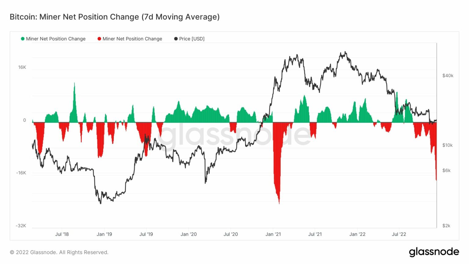 Glassnode’s latest “Bitcoin miner net position change” data shows that miners have sold aggressively in the last two weeks, to an extent that historically has only been higher in early 2021.