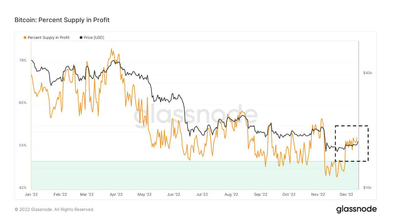 During bear markets, the percentage of Bitcoin addresses in profit had always dropped below 50%. Moving back above this threshold generally coincided with bullish price movements.