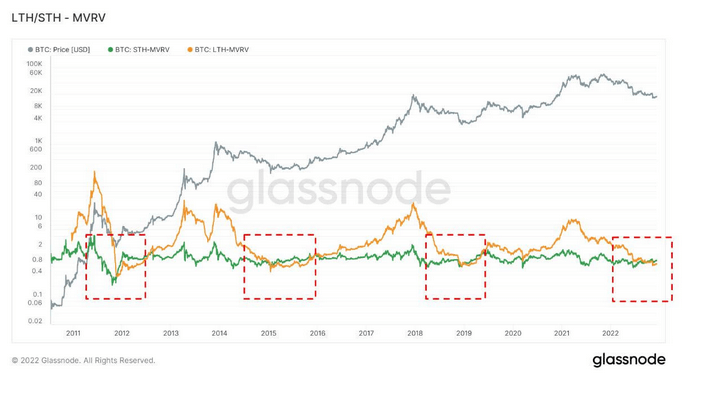 Previous cycle bottoms were characterized by a convergence of the STH-MVRV and LTH-MVRV lines, with the former crossing above the latter to signal a bullish reversal in price.