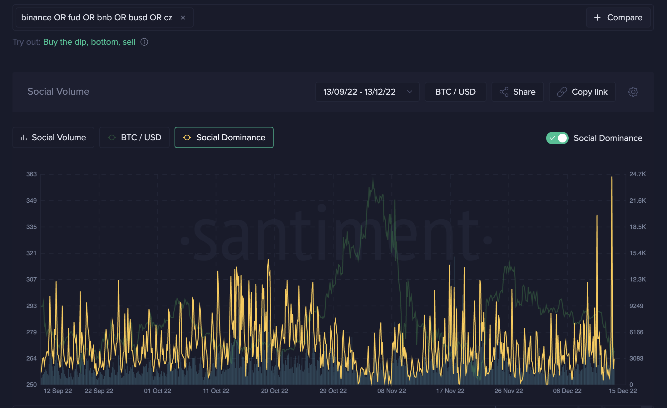 Crypto analytics firm Santiment notes that Binance rumors are dominating conversations on social media.