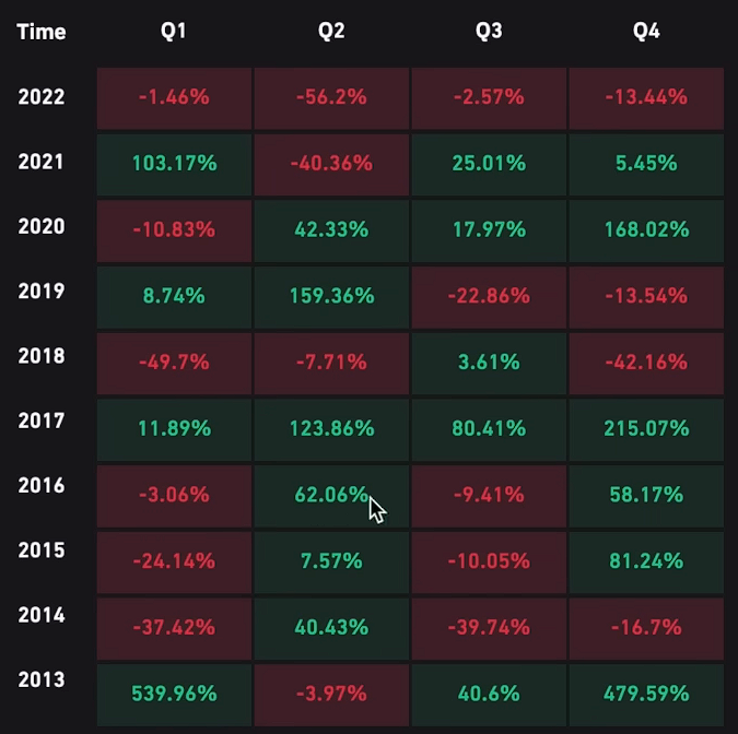 In a recent YouTube video, well-known cryptocurrency market analyst Jason Pizzino also addressed this unprecedented development in the Bitcoin quarterly chart. He presented and discussed a table in which he included the ROI of all historical quarterly periods.